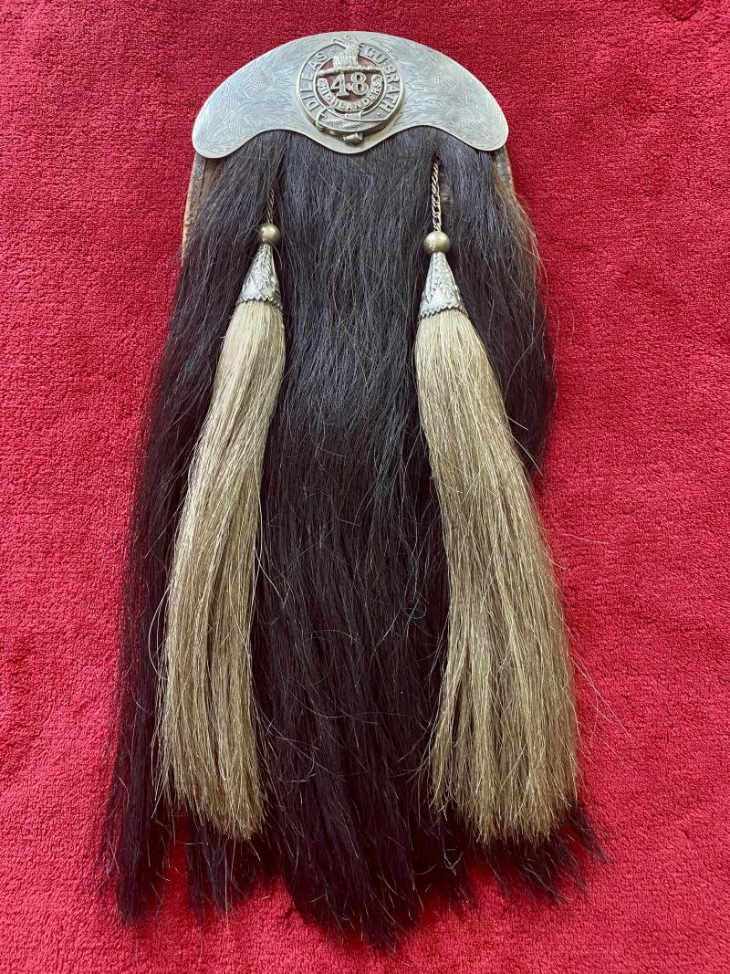 Here on offer is a rare example of a WW1 period 48th Canadian Highlanders horse hair and leather sporran named to Company Quartermaster Sergeant Major (CQMS), Frank James Stinson, service no. 192159. All I know is that CQMS Frank James Stinson was from Toronto and served in WW1 from 28th August 1917. This impressive sporran is in excellent condition and has a fine hand etched thistle motif on the bright nickel silver upper plate. Set onto the middle of this plate is a highly detailed 48th Canadian Highlanders silver regimental badge with a red felt backing. It displays the regimental motto: DILEAS GU BRATH (Faithful Forever) The long dark horse hair main section is attached securely to the plate and it is complete with its two light horse hair bristle tassels. These are suspended by small metal chains and have nickel silver tassel tops, with ornate raised thistle designs. On the back is a large opening rear leather purse that still retains its original top flap and inside, its edge flaps are still in place. On the top of the flap are the hand written but now faint owner's details, his name, rank and service number. The flap has some very small man-made holes but no sign of a button ever being fitted. Above the flap the two leather belt loops are still securely stitched in place and there are three old metal nuts that secure the front plate to the leather purse. The leather is in excellent condition and subtle for its age. It measures 17.5” (44.5cm) long and 7.2” (18cm) wide. It weighs 420g. Some history of the 48th Highlanders of Canada. The 48th Highlanders of Canada was founded in 1891, when the Toronto Scottish community succeeded in their efforts to have a Highland regiment in their young city. The Regiment has remained a Militia (Reserve) infantry regiment located in downtown Toronto ever since. A tartan, The Old Davidson, and a falcon's head for the regimental crest honour the first Commanding Officer, John Irvine Davidson. The original full dress scarlet uniform is still worn today. During WW1 The 15th Battalion (48th Highlanders of Canada) went overseas with the first Canadian contingent in October 1914 equipped in uniforms paid for by the Regiment. The 48th recruited three battalions, the 15th and two reinforcement battalions, 92nd and 134th. Facing the first gas attack of the war at the Second Battle of Ypres on 24 April 1915, the 48th were ordered to stand to the end. They did, losing 664 Highlanders, killed, wounded or prisoners of war. The 15th Battalion continued to the war's end in battles including the Somme, Passchendaele and Vimy Ridge, earning 21 Battle Honours. 1,625 Highlanders were killed in action. WW1 Battle Honours YPRES, 1915, '17; Gravenstafel; St. Julien; FESTUBERT, 1915; MOUNT SORREL; SOMME, 1916; Pozières; Thiepval; Ancre Heights; ARRAS, 1917, '18; Vimy, 1917; Arleux; Scarpe 1917, '18; HILL 70; Passchendaele; AMIENS; Drocourt-Quéant; HINDENBURG LINE; Canal du Nord; PURSUIT TO MONS; FRANCE AND FLANDERS, 1915-18. Please see my pictures for the details of the condition, which complement this description. Please see my TERMS OF BUSINESS regarding Deliver Charges and Insurance regarding additional insurance cover, should you require it, BEFORE the item is dispatched.