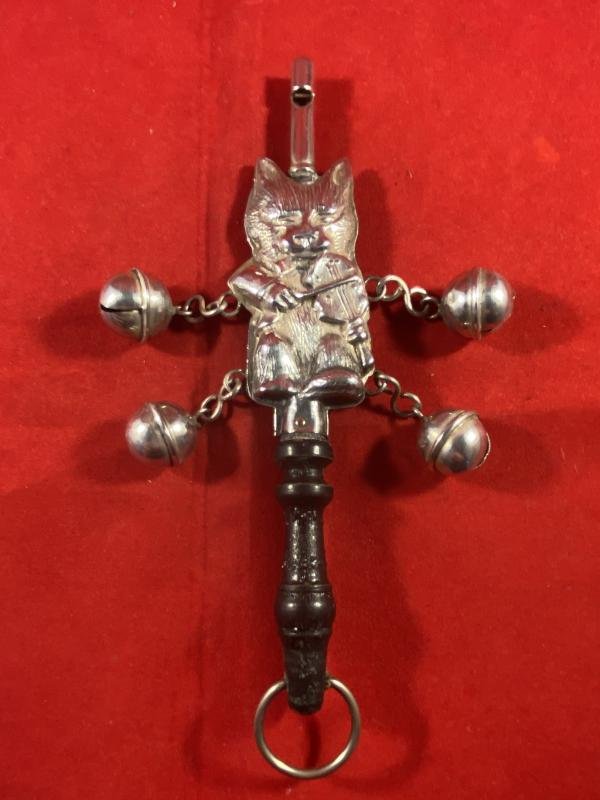 Here on offer is a vintage silver-plated ( I think) baby rattle and whistle, depicting the nursery rhyme “Cat and the Fiddle”. The main body is a cat playing a fiddle that it is attached to an ebonised wooden handle, complete with a metal suspension loop at the end. Attached to the top of the cat's head is a thin whistle, that still works perfectly. There are four round plated “rattle” balls, attached to the main body by metal links, two on each side. The rattle is in excellent condition undamaged condition. It measures 6.4” (16.2cm) long and weighs 38g. Please see my pictures for the details of the condition, which complement this description. Please see my TERMS OF BUSINESS regarding Deliver Charges and Insurance regarding additional insurance cover, should you require it, BEFORE the item is dispatched. The responsibility lies with the customer to check with your Customs restrictions that this item can be imported into your country.
