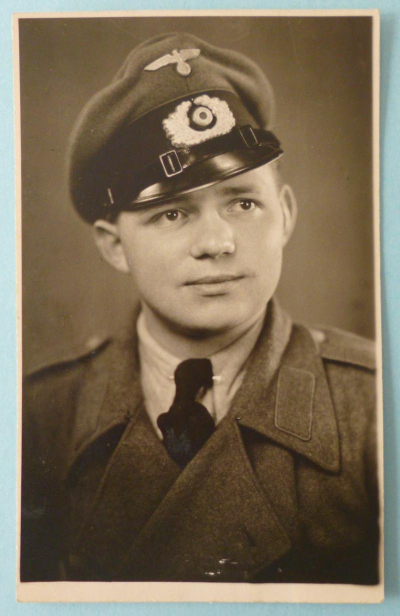 Portrait postcard / photo (140mm x 86mm) of an Army private soldier in an assault-gun unit.. He is wearing a service-cap with alloy insignia along with a field-grey assault-gun Panzer wrap-over jacket bearing plain piped field-grey collar-patches . Excellent detail and the photo is in very nice condition with traces of having once been in an album on the reverse. A penciled number on the reverse suggests a date of 1944.