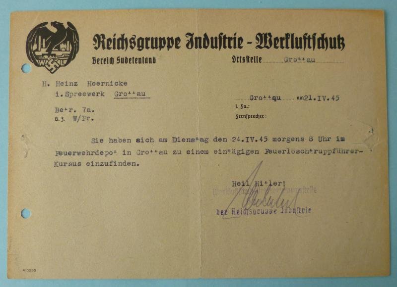 A5 letter headed 'Reichsgruppe Industrie - Werkluftschutz' in Grottau in the Sudetenland instructing a Heinz Hoernicke to attend a Feuerlöschtruppführer course in the local fire-station on 24th April 1945. Signed 'Heil Hitler'.Two punch-holes for filing and a slight scuff in the paper on the right-hand side otherwise excellent condition.