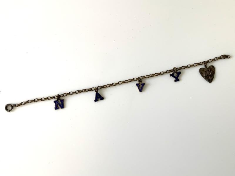 Here is a WWII Navy sweetheart bracelet. Blue enamel letters. Measures 7 1/4”