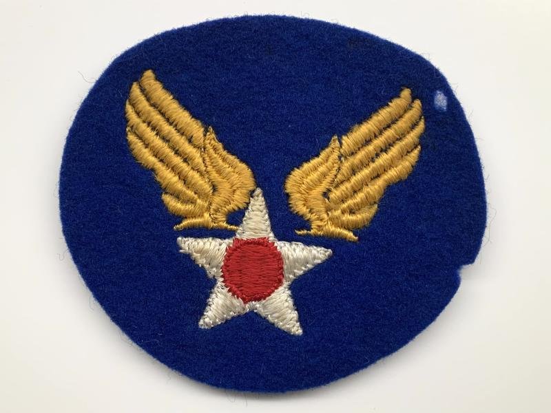 USAAF shoulder patch, embroidered on wool, slight cut at 3 o'clock on the outer edge and a small hole at the 1 o'clock (see Image 3) Measures 2 3/4” diameter.