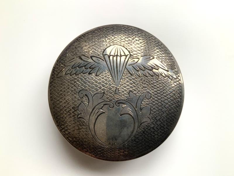 Here is a sweetheart Compac with Paratrooper Wings engraved on the lid. Hinged lid opens to reveal a mirror on the inside of the lid and the powder fittings. Comes in a maroon felt cover. Measures 2 3/8”