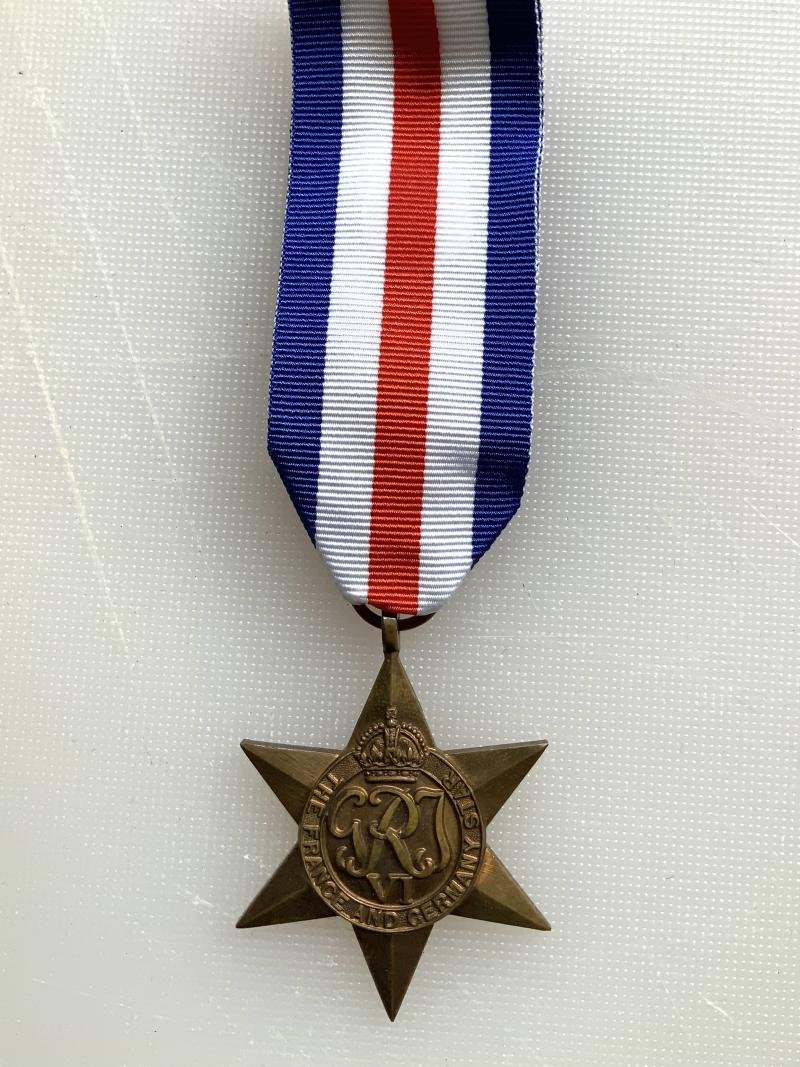 A France and Germany Star with ribbon but no fixing pin and in good condition. The France and Germany Star is a military campaign medal, instituted by the United Kingdom in May 1945 for award to British Commonwealth forces who served in France, Belgium, Luxembourg, the Netherlands or Germany and adjacent sea areas between 6 June 1944 and 8 May 1945,
