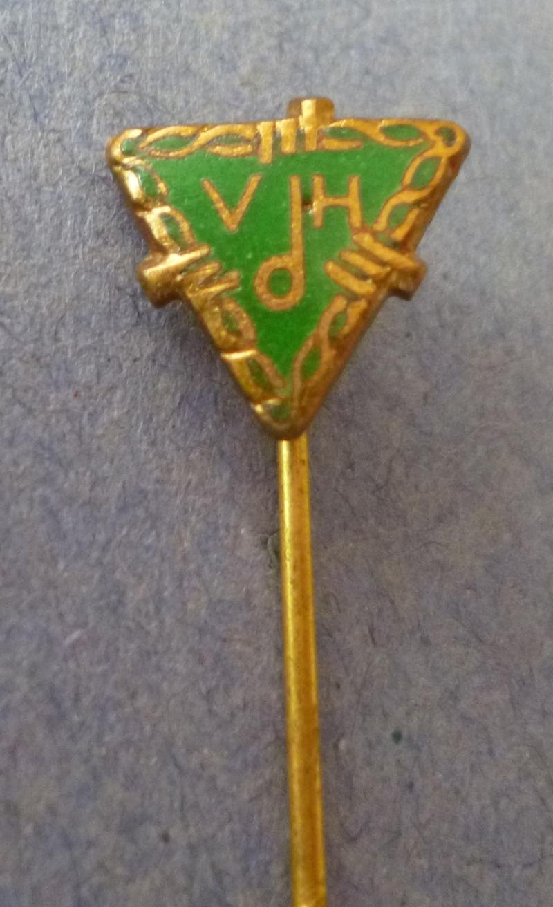 Green enameled gilt-metal small lapel badge of the VdH (Association of Returnees), a charitable organisation established in 1950 in West Germany to look after and assist German and Austrian prisoners-of-war returning from Soviet captivity. After upto ten years in Russian hands, many were returning homeless, jobless and in many cases to find wives re-married ! The reverse is fitted with a long knurled stickpin. Excellent condition.