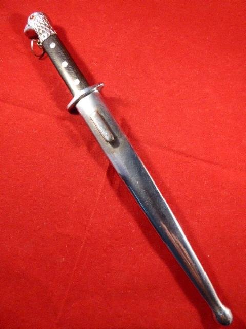 Here on offer is an unusual and rare version of a WW2 Romanian Army dagger with scabbard. This seems to be more of a “commando” style dagger than the usual ornate dress daggers? There is no maker mark on this dagger as is common with these Romanian daggers. The hilt fittings are all Nickel-plated and show no signs of rust or pitting. The ornate pommel is in the shape of an eagle's head and it still retains its original red glass eyes and portepee loop/ring. There is light surface wear to the reverse of the eagle head pommel where it would have rubbed against the uniform. Now what is unusual about this dagger are the dark brown and very slightly chequered grip plates, which are held in place with three smooth metal rivets. No sign of an emblem ever having been fitted as seen on many of these dress daggers. These fit the dagger perfectly and connect to a plain elongated oval almost “commando” style crossguard, not the usual oak leaf embellished downturned crossguard. The Nickel-plated, double-edged stiletto shaped blade shows light surface wear/runner marks to the ricasso. The tip shows signs of having been bent and reshaped but there is no loss of plating or pitting to the finish. The dent-free nickel-plated scabbard with bayonet-style suspension lug shows light surface wear and minor pitting, but no lifting to plating. The blade measures 6.7” (17cm) and the dagger in the scabbard measures a total of 11.4” (29cm) long. It weighs 225g. Please see my pictures for the details of the condition, which complement this description. Please see my TERMS OF BUSINESS regarding Deliver Charges and Insurance regarding additional insurance cover, should you require it, BEFORE the item is dispatched. The responsibility lies with the customer to check with your Customs restrictions that this item can be imported into your country.
