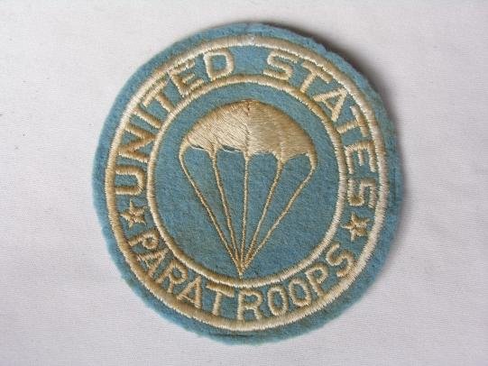 A good U.S. Paratroops Jacket patch, embroidered on wool with a cheese cloth back. Large size at 3 3/4'