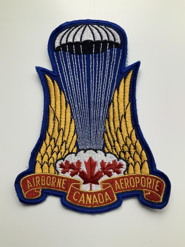 1st Battalion Special Operations Canadian Airborne Aeroporte jacket patch. Fully embroidered on twill with a cheese cloth back. Large size at 7 3/4” x 6 1/8” The main proponent of the Airborne was General Jean Victor Allard who, as commander of the Army (i.e. Mobile Command) and then Chief of Defence Staff, created it between 1965 and 1968 as a large rapid-reaction, light mobile force, suitable for overseas brigade-size missions. It was designed as a flexible short-term immediate response available to the government when it accepted an overseas reinforcement or intervention mission within NATO, or elsewhere. It would be replaced in a brigade's proposed mission area, after no more than a few weeks, once the main body of a heavier brigade was mobilized and transported with its fighting vehicles and support to the area.