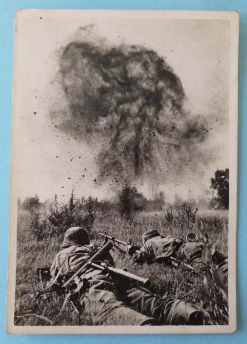 Original postcard from the 'Unsere Waffen-SS' series featuring excellent photos taken by various SS-Kriegsberichter. This one is entitled on the reverse 'Volle Deckung' (Hit the deck) and shows an SS MG34 gun-pair under artillery fire. Very good condition with only light handling wear.