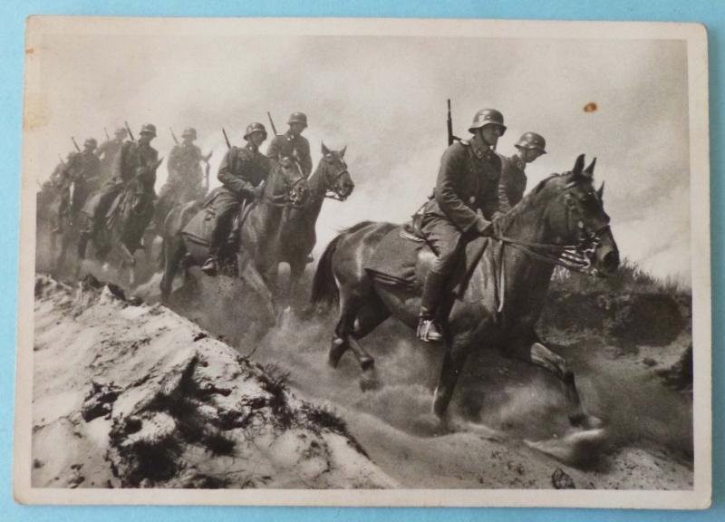 Original postcard from the 'Unsere Waffen-SS' series featuring excellent photos taken by various SS-Kriegsberichter. This one is entitled on the reverse 'Kavallerie auf einem Uebungsritt' (cavalry on an exercise-ride) and shows a group from an SS-Kavallerie-Brigade riding out on exercise. Very good condition with only light handling wear.