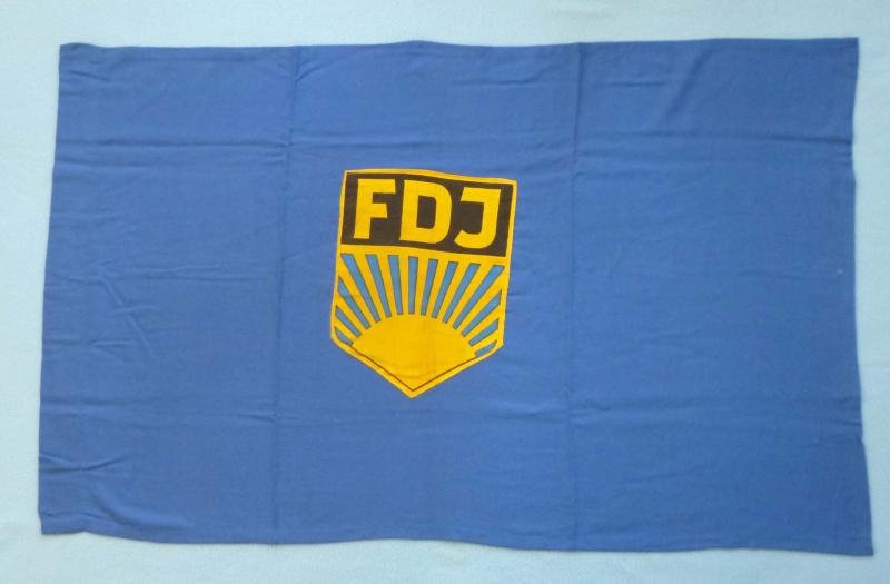 Blue cloth flag with printed FDJ emblems stitched to both sides. The flag measures 96cms x 61cms and has a sleeve at one end to accommodate the pole. Very good clean condition. (Free German Youth (FDJ) was founded in 1946 as a communist organisation for 14 to 25 year olds, both male and female).