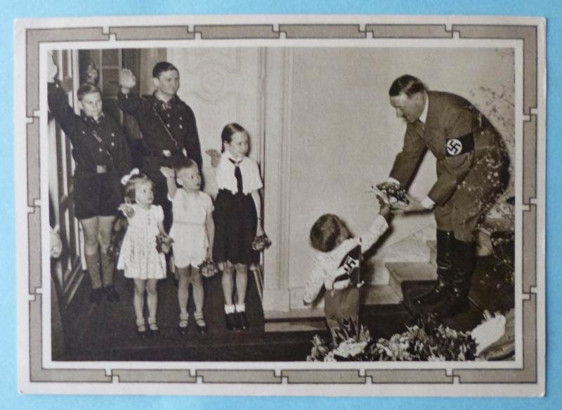 Unused and un-captioned postcard-photo of Hitler in uniform being presented with flower-posies by a group of young children including some in DJ and JM uniforms. The reverse bears an un-franked printed postage-stamp. This card is one of a series of PR postcards. Excellent condition.