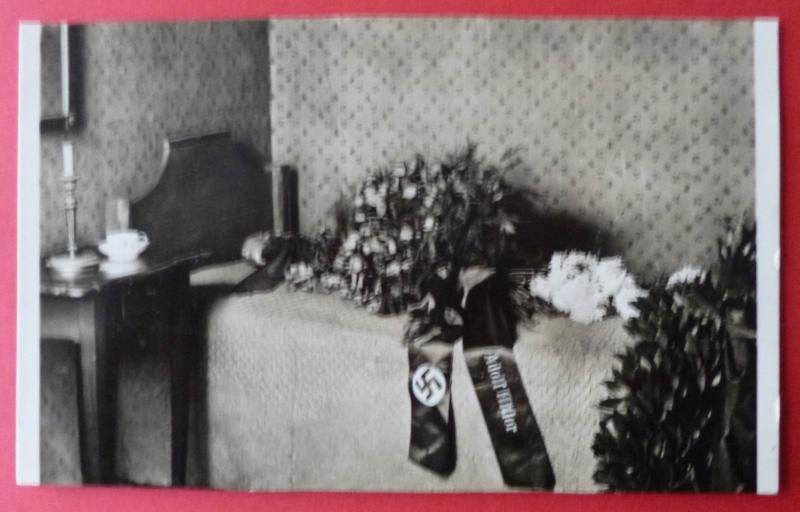 Johann Christoph Friedrich Schiller was a renowned German playwright, poet, and philosopher.who died on 9th May 1805. The unused postcard shows the bed where he died in his house in Weimar, the bed having a wreath from Hitler placed upon it. The reverse is entitled 'Schillerhaus, Weimar; Schillers Sterbezimmer'. Very good condition.