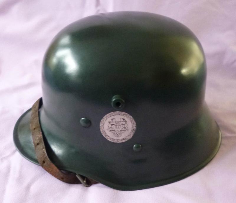 A very nice re-conditioned M.16 style helmet, painted dark-green with Danzig police decals applied on each side. The helmet was officially re-lined with a M.31 liner plus chin-strap having been refurbished after the First World War and used during the period of the Third Reich. Excellent condition with minimal wear to the lining. No size stamp and the only visible marking looks like '1000' or 'BBB' stamped into the rim below the right-hand chin-strap fixing. Payment by cheque or bank-transfer please.