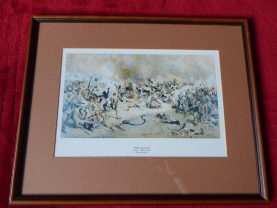 Here on offer is a framed colour print of the Battle of Tofrek in Sudan on 22nd March 1885 by the 49th Regiment. The print is in excellent clear crisp condition and has been professionally mounted and framed with a clear glass front and thin light coloured wood edges. The Battle of Tofrek was fought on 22nd March 1885 some 5 miles inland from the port of Suakin on the Red Sea coast of Sudan. A contingent of some 3000 troops from the British and Indian “Suakin Field Force” led by Major General Sir John Carstairs was attacked by a Mahdist force under the leadership of Osman Digna. The Mahdists were heavily defeated, losing some 1000 of their 2000 fighters as compared to the loss of 70 British and Indian soldiers plus over 100 casualties. It became a hollow victory however, when two months later, the British government changed tack and withdrew the bulk of its forces from the Sudan, leaving the Mahdi's successor, Abdallahi ibn Muhammad (the Khalifa), in control of the region for the next 13 years. The frame measures 18.25” (46.3cm) by 14.6” (37.2cm). It weighs 1.4kg. As this is a large and heavy item, UK postage will be £12 via Parcel Force and please contact me via email for the international postage charge for your specific country. Please see my pictures for the details of the condition, which complement this description. Please see my TERMS OF BUSINESS regarding Deliver Charges and Insurance regarding additional insurance cover, should you require it, BEFORE the item is dispatched. The responsibility lies with the customer to check with your Customs restrictions that this item can be imported into your country.