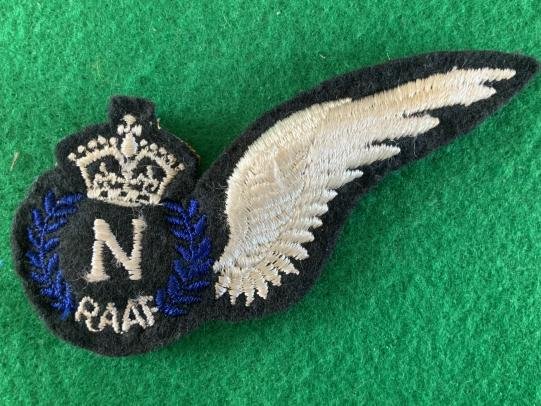 Here is an RAAF trained Commonwealth N half wing. Wing was awarded in Canada after completing training. A padded example in good condition. Measures 4 1/8”. See Eagles Recalled book page 132 for more information.