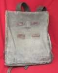 Original period manufacture. Stone gray colored canvas flap with brown leather loops for attaching the messkit. Heavy gray cotton interior with brown leather internal straps Maker marked and dated 1917 on the reverse of the pack at the top. The shoulder straps are present, but are missing their buckles. Normal age and wear.