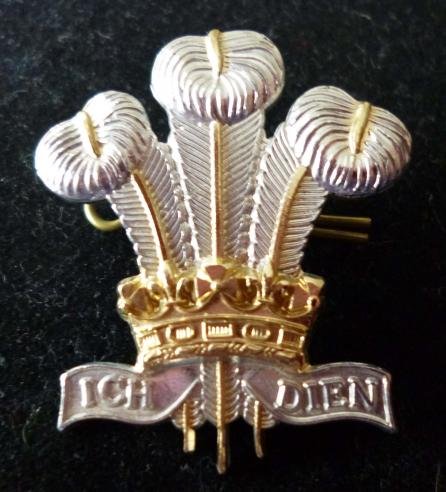 Anodised aluminium Prince of Wales feathers in gilt and silver complete with two lugs and split-pin fixing on the reverse. This regiment was formed in 1969 by the amalgamation of the South Wales Borderers and the Welch Regiment. It lasted until 1st March 2006 when they were amalgamted with the Royal Welch Fusiliers to form the Royal Welsh.