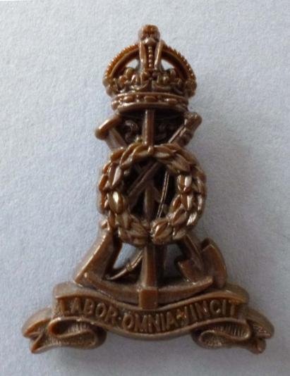 Brown plastic King's crown cap-badge complete with both brass blade fixings on the reverse along with the makers mark 'A. Stanley & Sons, Walsall'. There is also a '1.A' reference number. Raised in 1939, The Pioneer Corps had existed previously in WW1 as The Labour Corps. After WW2 they became The Royal Pioneer Corps.
