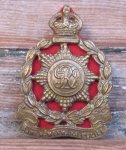 Original period manufacture. British WWII Ajmer-Merwara Police Hat Badge, stamped brass with a red wool backing. Measures 37 x 50 mm.