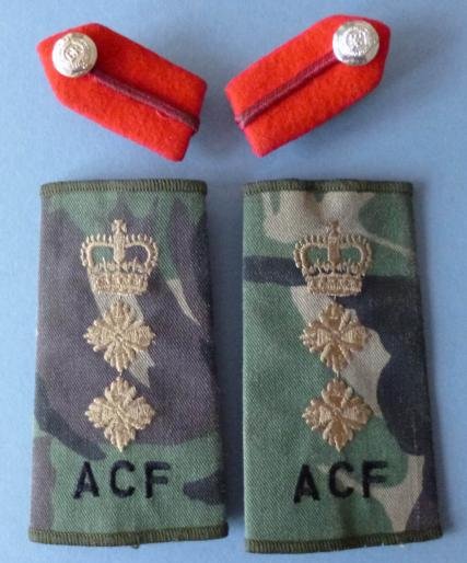 Matched pair of Colonel's red clip-on gorget patches together with a pair of ACF Colonel's rank-slides machine embroidered on DPM camouflage material. This set would have been worn by a Colonel Commandant of a County Cadet Force.