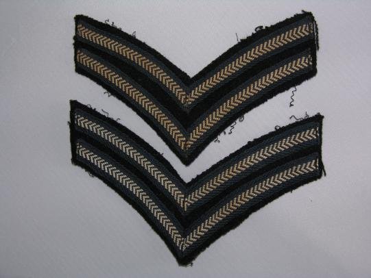 A matching pair of WWII RAF Corporal Rank removed from uniform good condition on correct felt background.