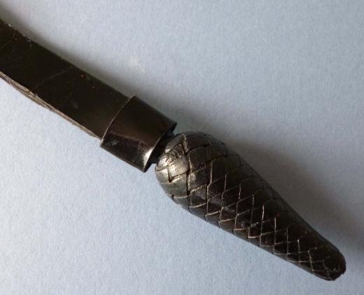 Black-leather woven acorn with 38cm long strap. Overall length 44cm. This has been used but is in good condition.