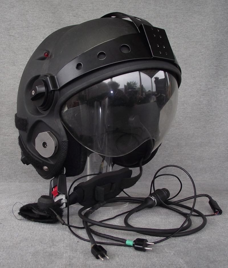 Helmet is in very nice condition with only a couple of minor scuffs to the finish, no knocks or dinks. Clear pull down visor is clean , couple of minor scratches only. Both side helmet red light bulbs are present and undamaged . The inside padded liner system is complete and has little wear with its avionics and chinstrap. This example comes with its wire loom including microphone ''on/off'' switch. Sorry i cannot find a size but would estimate as medium. Back data label dates the helmet being produced in 2008.