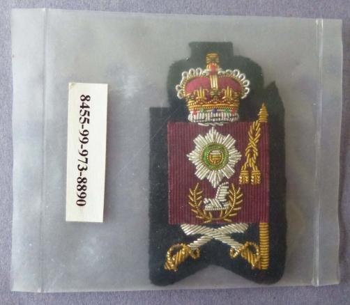 Hand-embroidered in gold and silver wire and silk on black backing. Queen's crown badge still sealed in its original packet bearing NSNo. 8455-99-973-8890. Unissued. 70mm high.