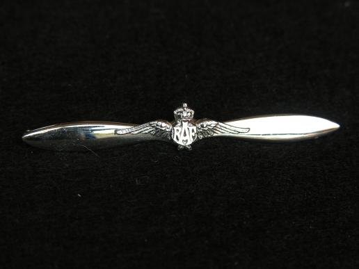 An RAF sweetheart broach pin back, measures 3' across. Note some minor damage to the chrome plate on the bottom of the left end of the propeller.