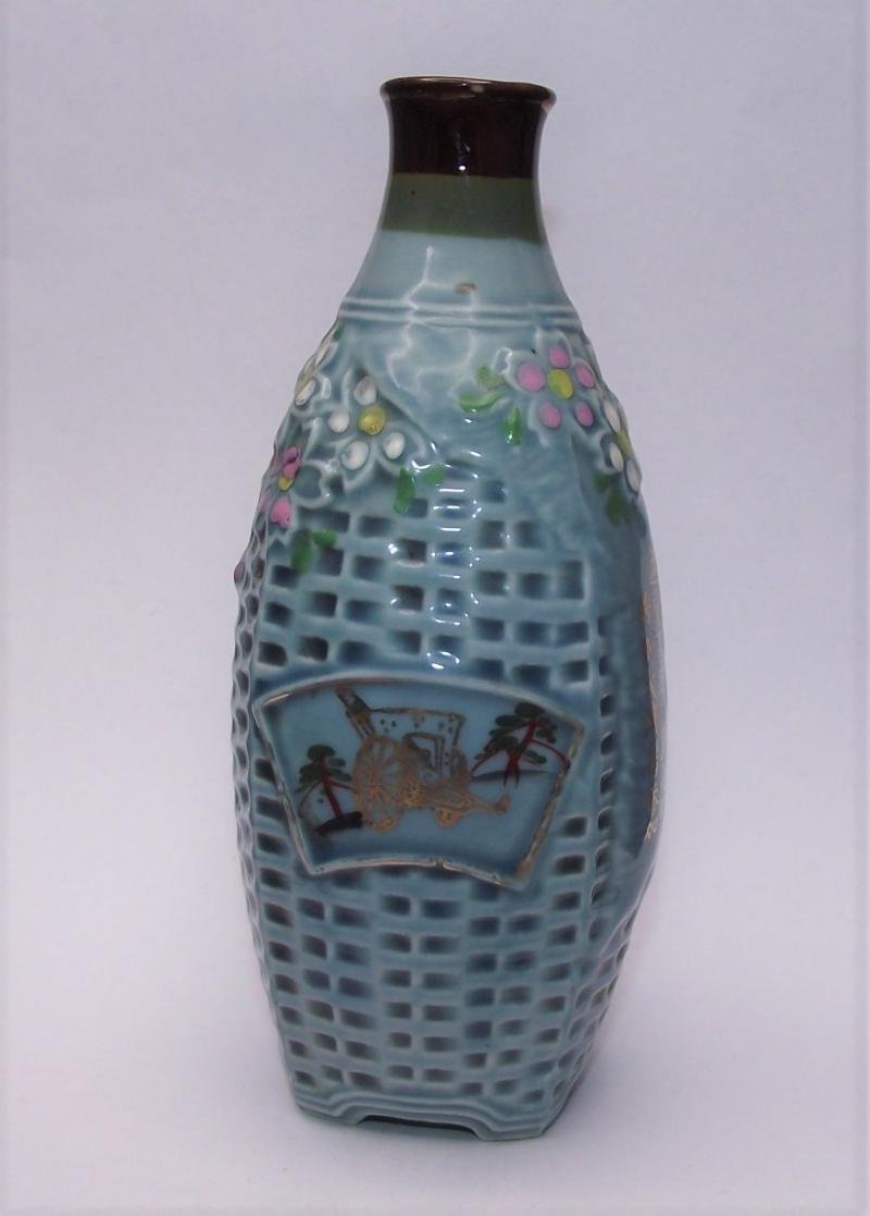 A very nice example with a type of raffeta design running around the bottle with chrysamthemum's to the top. The center has a hand painted Artillery cannon and the side hand painted Kanji. Condition is very good with only one tiny chip to the rim.