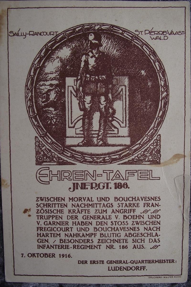 Regiment 186 during 1918 was attached to the 56th infantry division and fought in Arras and Verdun. Condition is good and sent out in 1918.