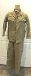 Original era manufacture. A three piece set consisting of a four pocket coat, trousers and military style field cap. Overall condition is near new, showing primarily storage wear only.