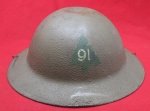 Original era manufacture. Handpainted 91st Division emblem on the helmet's front, with a complete liner with adjusting tag in place, and the leather chinstrap is all there. This helmet was produced with the provision for the Wilmer Eyeshield attachment, having three holes drilled into the edge of each side of the helmet rim, with a single split ring for adjustment purposes. Overall the helmet is quite sound, only negative is a dent in the bowl at top center.