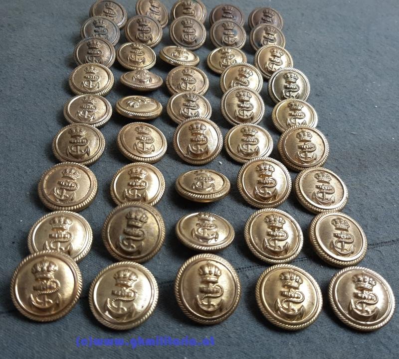 k.u.k. Kriegsmarine Knöpfe für Flottenrock usw. - Ausführung groß!! - 2,3cm Durchmesser - verschiedene Hersteller vorhanden - 40x Stück Knöpfe vorhanden - verschiedene Hersteller z.B.: 3 Stück Brüder Schneider Wien Rückseite Silber - 16 Stück Offiz. Uniformierung Pola BSW - 9 Stück A.U. - 1 Stück Brüder Schneider Wien Rückseite Gold - 10 Stück O. U. P. BSW - 4x A. U. 1a Qualität - 1x BSW k.u.k. Hoflieferant - 1x BSW Punze - verschiedene Erhaltungszustände siehe Fotos! - Preis 10€ bezieht sich auf 1 Stück Knopf !!