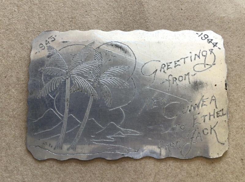 Rectangular piece of aluminium cut from a downed Japanese aircraft. The obverse polished and hand engraved “Greeting from New Guinea 1943/1944” and “To Ethel from Jack”. With a palm tree island scene. Approx The reverse with the original Japanese aircraft paint.