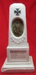 Original era manufacture. Plaster monument decorated with an Iron Cross at top, with a soldiers photo below. At the bottom in gold leaf reads the following, 'You Shall Not Weep. He died a Hero in the fight for us, on a holy battlefield'. Stands 12.5 inches in height. Old nicks and chips at the bottom, not detracting.