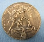 Original era manufacture. German WWII 1938 Reichsparteitag Tinnie, zinc badge with a pinback reverse. Measures 42 mm in width.