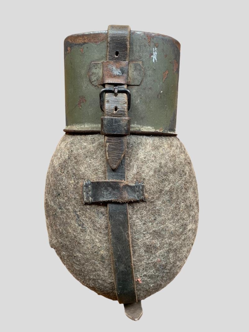 In nice condition a WH (HEER) M31 Canteen and Cup. The canteen is nicely factory code marked 'CFL' and dated 19444, the cup is nicely dated 1943 and probably made by 'AEMA' (Annweiler Email-u. Metall-Werke,Anweil). Nice canteen and cup for sure!