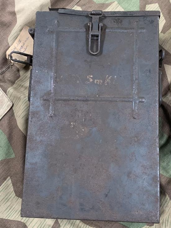 Rare original German fortress ammunition belt box for the mg34. SMK marked with lots original grey remaining to the interior and some to the exterior. These elaborate containers were designed in order to reduce the weight of a loaded belt in order to prevent malfunction of the Mg34 feed system.
