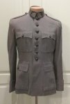 Original era manufacture. Gabardine blue-gray closed collar, four pocket tunic with darkened bursting bomb buttons throughout. Full gray color, imitation silk body lining with striped white silk sleeve lining. Size about a snug 40 regular. No holes or tears, just some scattered areas of staining and fading from age and use. Old costume house tag sewn inside the lining.
