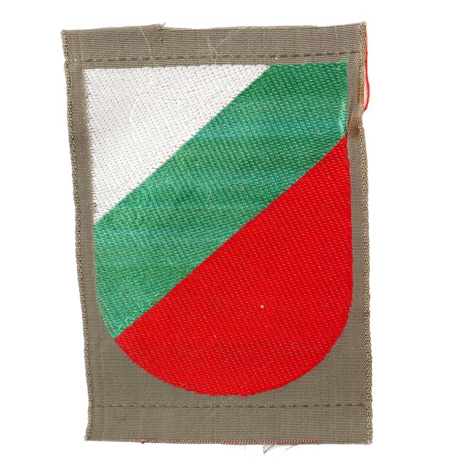WH (Heer) BeVo woven sleeve-shield as intended for a Bulgarian volunteer within the German Army (Landeschilde). The shield is executed in the neat so-called BeVo weave style on a field-grey linnen background. There was no specific Bulgarian volunteer legion within the German Army, Bulgarian volunteers where used as replacements in the regular German Army units. This shield is showing the Bulgarian national colours in white, green and red and was used to identify Bulgarian personel. Rare and hard to find volunteer shield in very good, mint and unissued, condition.
