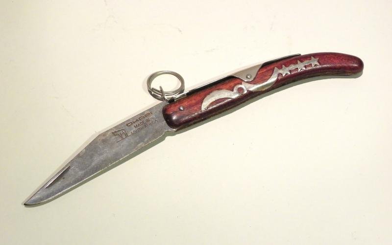 I have a few of these, old new stock. Made by Okapi South Africa, made to be affordable for everyday use on the farm or in the bush. It is a slip-joint rachet folding knife with a hard wood grip decorated with inlayed metal and a good steel blade with maker's mark. It is in perfect order with just storage wear. It measures 9.5 inches long when open. Ship to UK only to over 18's only