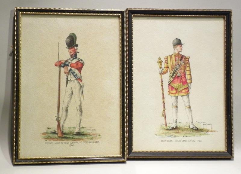 A pair of very well executed watercolour painting of a Private of the Coldstream Guards 1793 and a 1938 Drum Major of the same regiment, both by Peter Russell and probably dating from the 1960's – 70's. both are framed and glazed in the typical 1960's style and measure 7.5 x 10.5 inches.