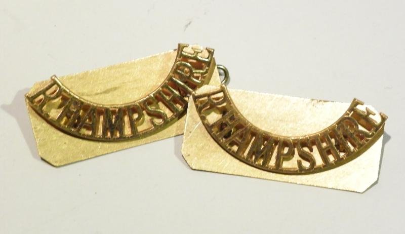 Just post WW2 Royal Hampshire regiment brass shoulder titles issued from 1946 to the early 1950's in this larger style. Both are in near mint condition with original backing plate and pins, old new stock ex-military stores.