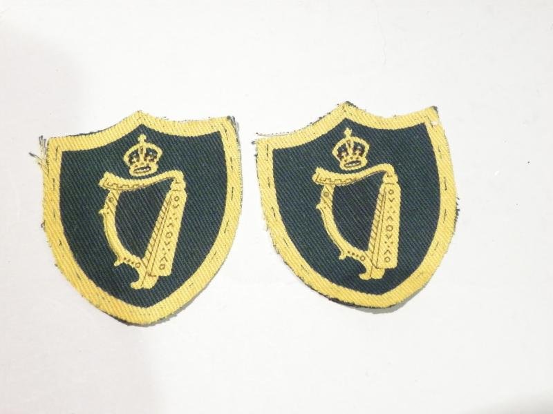 Pair of WW2 screen printed cloth badges for the Northern Ireland District HQ. During the Second World War the role of the District was enhanced from internal security to that of combatting any threat of invasion from the Republic of Ireland.3 In June 1940, VI Corps was formed to control the British forces based in Northern Ireland. Northern Ireland District was made responsible for all local defence. Both badges are in excellent unused condition with kings crown, measuring 2.25 x 2.5 inches.