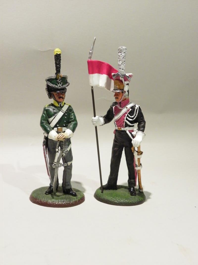 Two very good quality hand painted Del Prado die cast metal figurines of early 19th century soldiers, one is a Polish Lancer, French guard cavalry 1807, the other is a Trooper Belgian 5th light Dragoons 1815, both are in very good condition and the tallest one stands just over 3.5 inches tall.