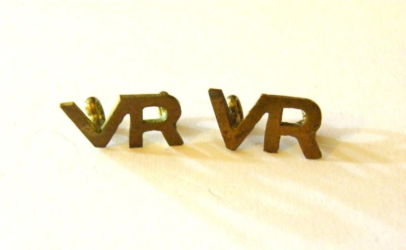 Brass V R Badges worn by the Royal Air Force Volunteer Reserve from 1941 to 1944. This pair are in good used condition. Ref. AF14