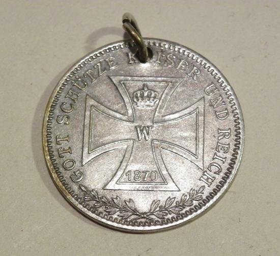 An interesting piece dating from 1870 during the Franco-Prussian war, it features to one side a female figure in a landscape with the river around her and the legend 'fest steht und true die wacht am Rhein' which translates as 'the watch on the Rhein' this originates from a patriotic anthem used during the early war up to the first world war, on the reverse is the German cross with the date of 1870 within. The piece comes in very good condition but has been holed with a jump ring for wearing, it measures just over one inch in diameter.