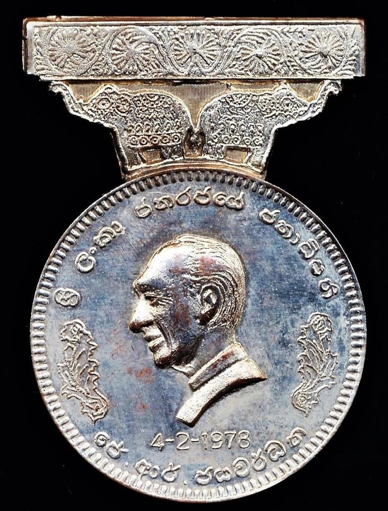 Commemorating the inauguration of the second President of Sri Lanka, Junius Richard Jayewardene, who became President on 4 February 1978 An attractive cupro-nickel medal, with ornate pair of 'Facing' Asian Elephants suspension. With portrait of Jayewardene on the obverse, with date of the inauguration below Reverse of medal with pin-back fittings as issued Condition: GVF